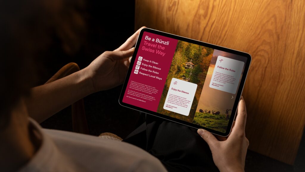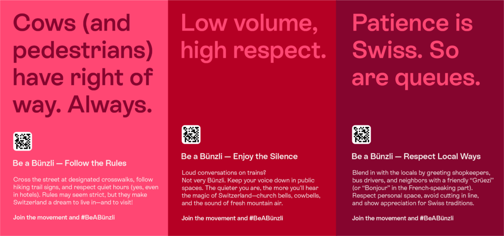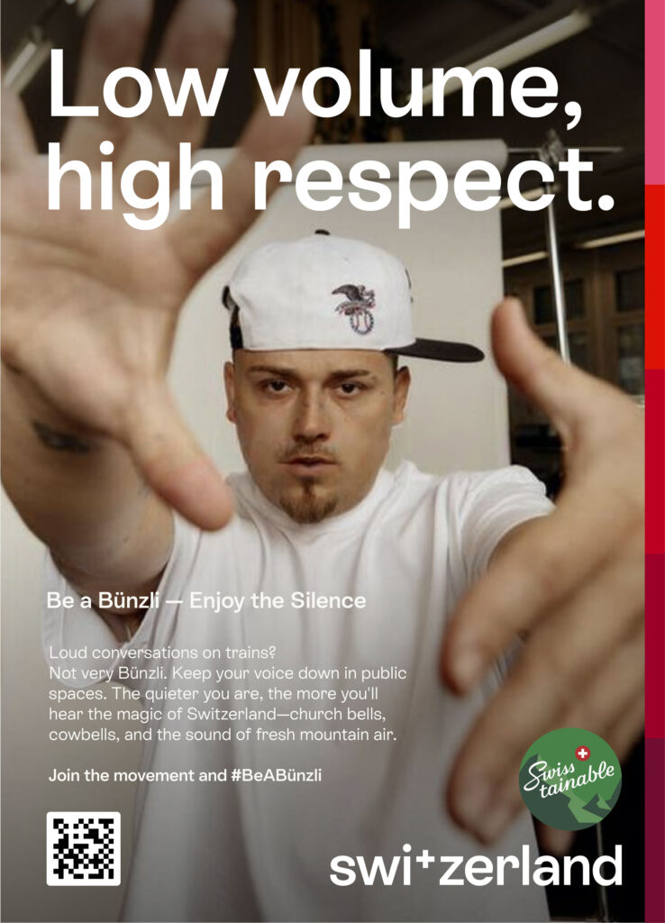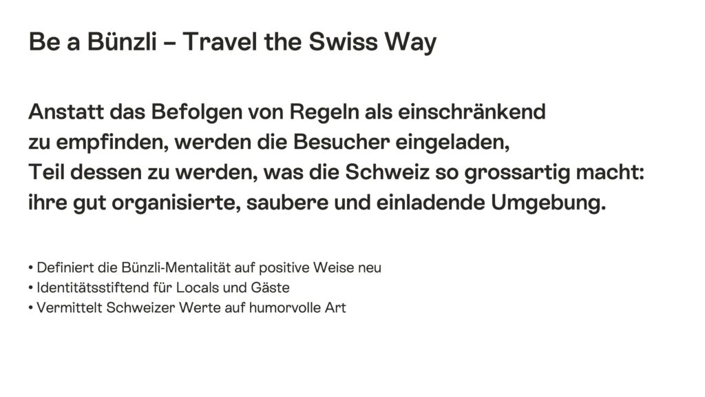 Rising tourism numbers and increasing tensions between locals and visitors have created a need for proactive communication. «Be a Bünzli – Travel the Swiss Way» redefines the traditional Bünzli mindset in a positive way, inviting visitors to become part of what makes Switzerland so special: its well-organised, clean, and welcoming environment.