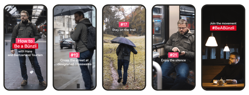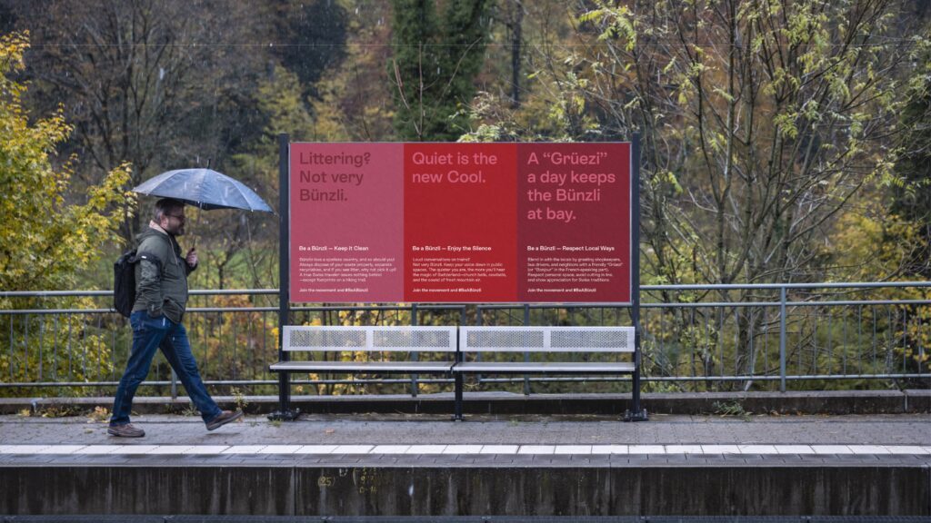 Solution: «Be a Bünzli – Travel the Swiss Way» redefines the traditional Bünzli mindset in a positive way, inviting visitors to become part of what makes Switzerland so special: its well-organised, clean, and welcoming environment. Instead of experiencing rules as restrictive, guests are encouraged to see them as part of a shared cultural identity that connects locals and visitors alike. Multiple ambassadors are used to address different target groups and communicate Swiss values in a humorous, accessible, and identity-building way across various touchpoints.